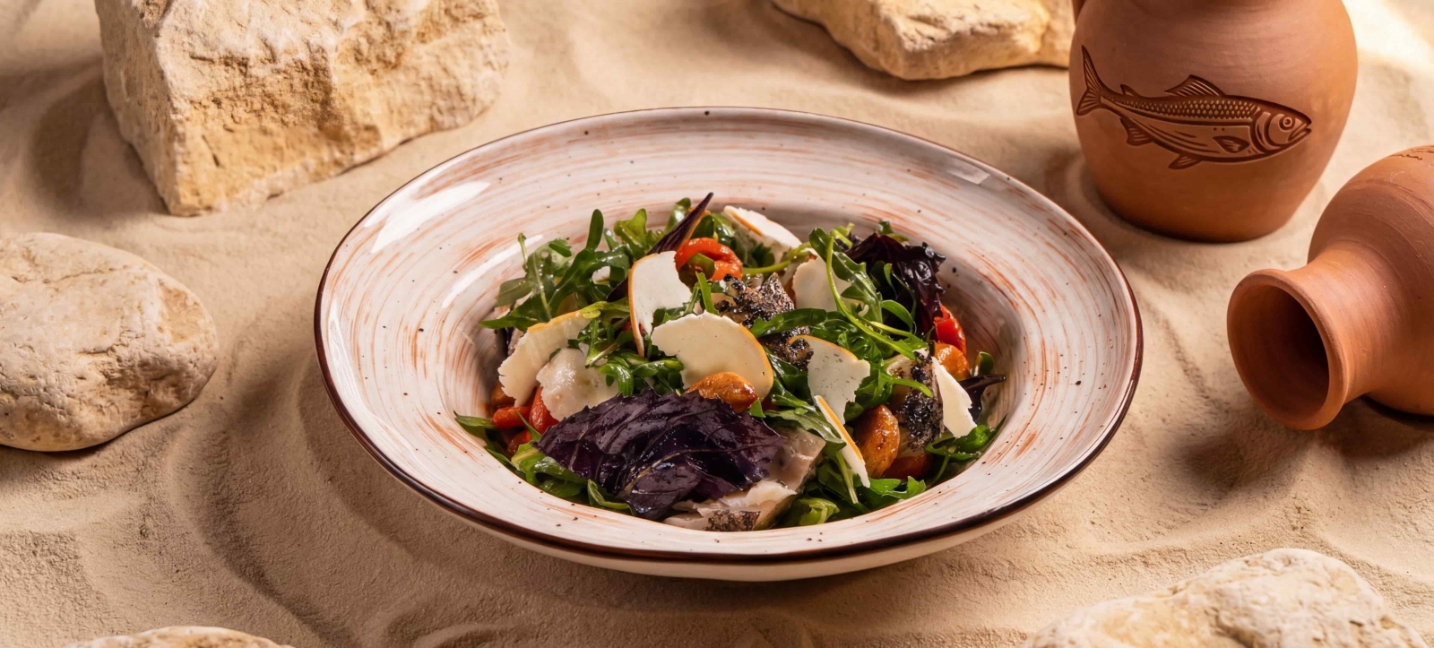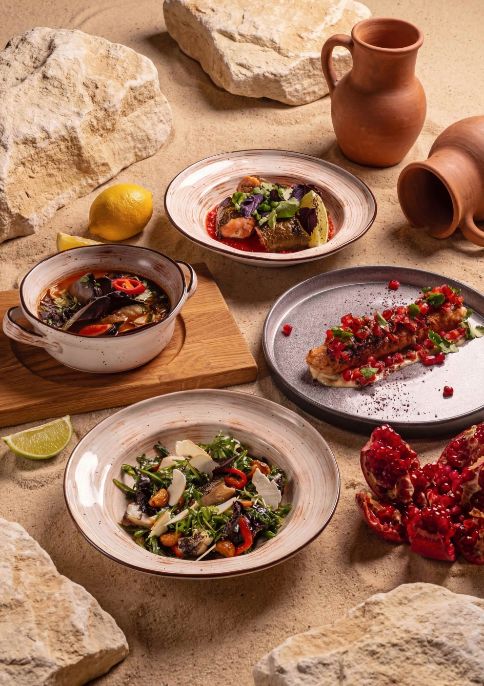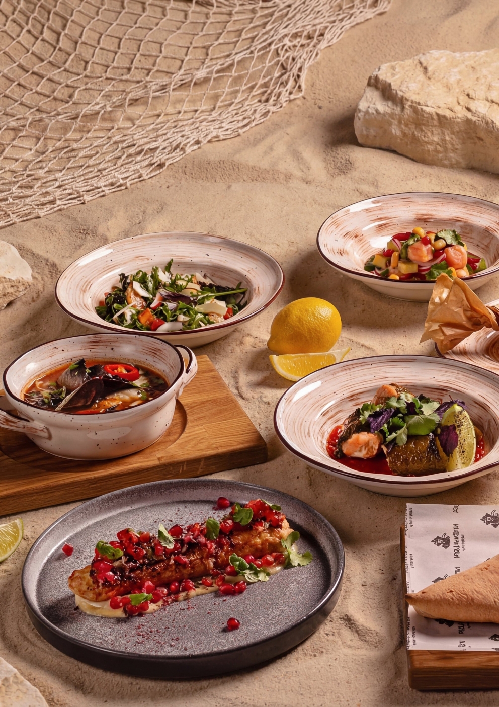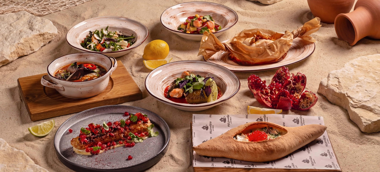 Открывает вечер севиче из форели — нежные ломтики в цитрусовом маринаде с соусом киндзмари и хрустящей кукурузой. Следом — салат с кефалью и копчёным сулугуни: тёплый дымок сыра, зелень и грузинские специи. На горячее — сочный люля-кебаб из креветок с густым чесночно-сливочным чкмерули и форель в виноградном листе с ореховой начинкой, запечённая до золотистой корочки. Завершает ужин воздушная Павлова «Морская ракушка» — меренга с кремом и свежими ягодами. Каждое блюдо подаётся с вином от грузинского бренда Askaneli, представленного в России компанией «Лудинг».