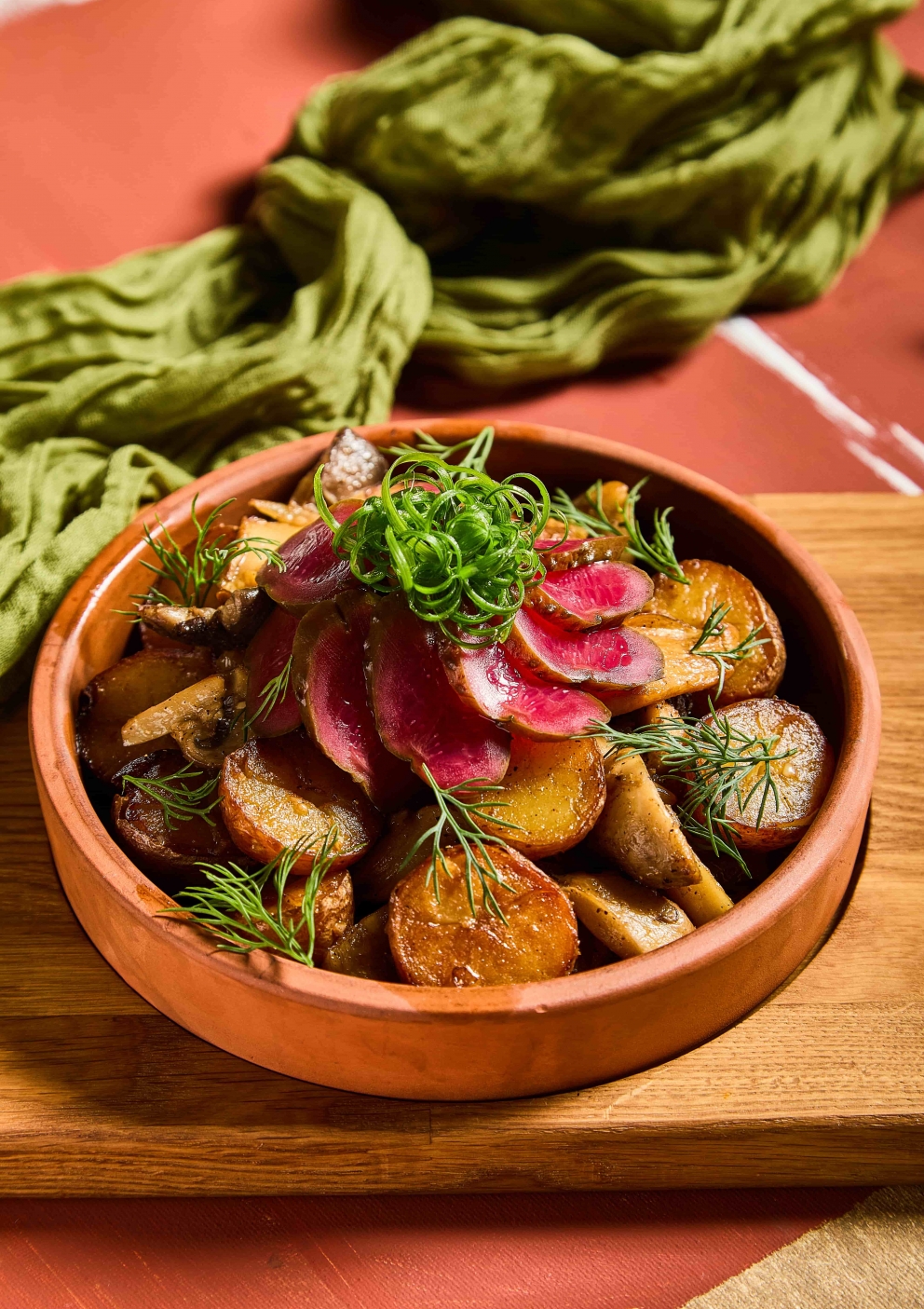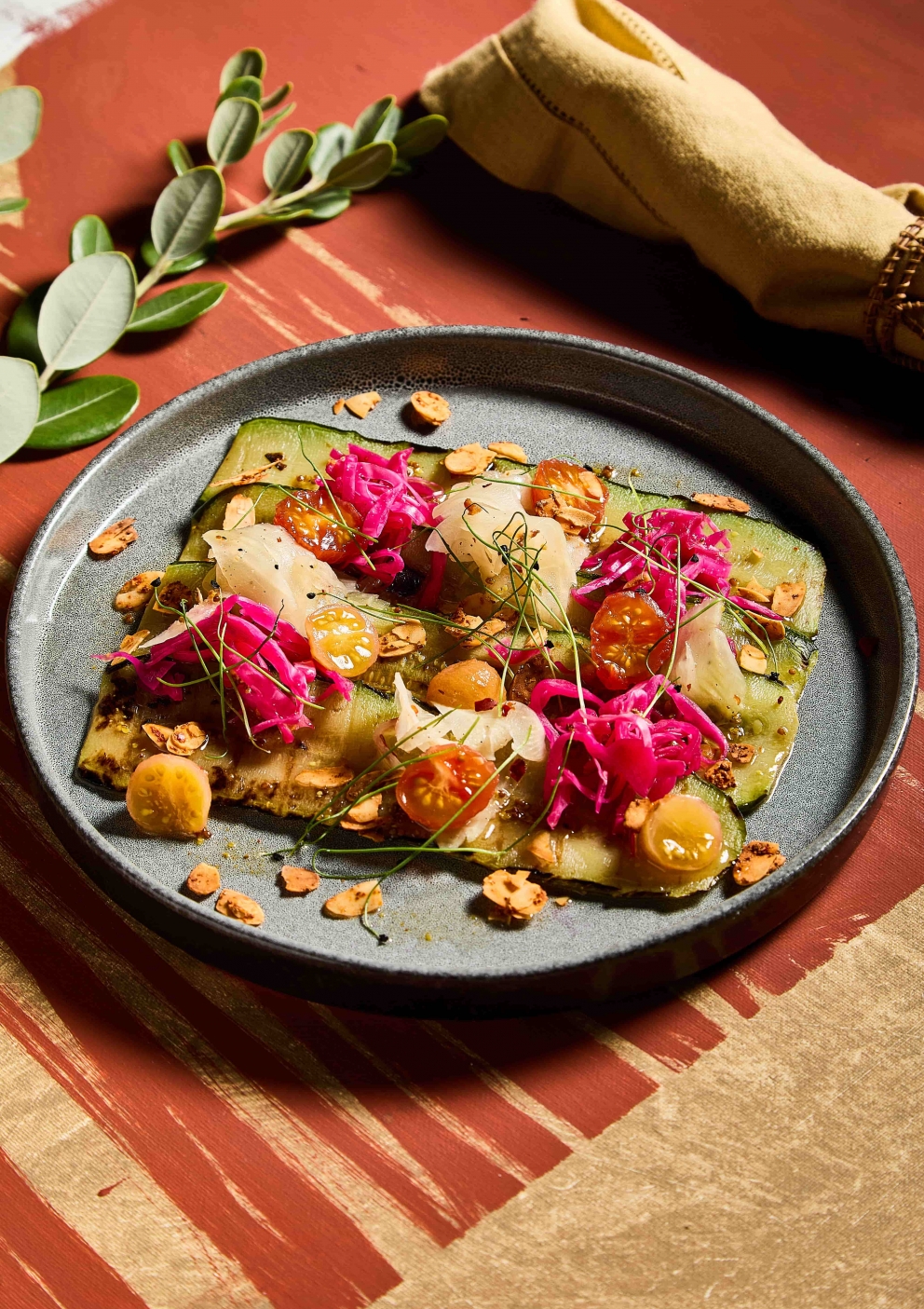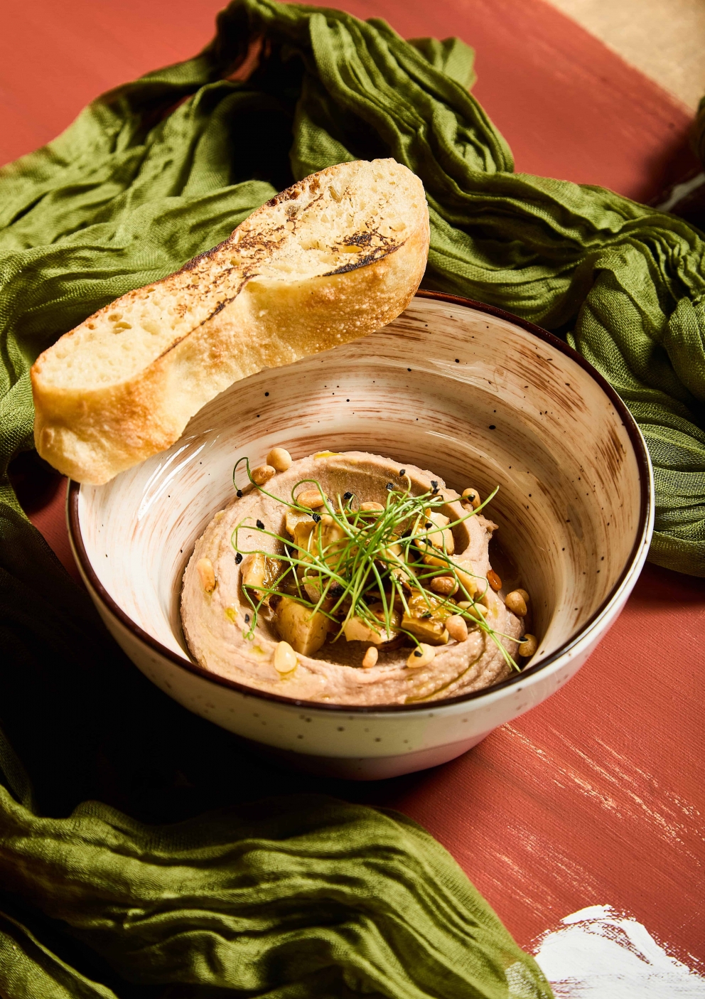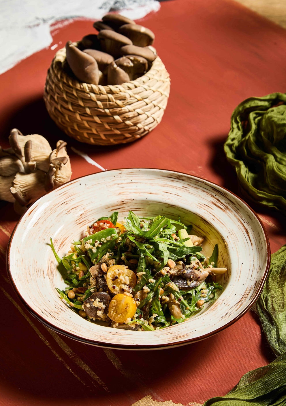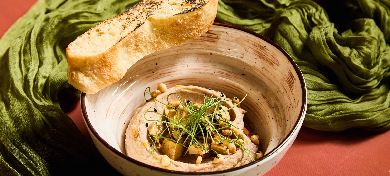 К примеру, сациви для постного стола мы приготовили из баклажанов с маринованными томатами, карпаччо — из обжаренных кабачков с гурийской капустой, а нежный кремовый хумус из белой фасоли дополнили лесными грибами и кедровыми орешками. Ценителям салатов предложим яркий винегрет из печёных овощей с квашеной капустой и салат с золотистыми вёшенками, киноа, авокадо и пикантным ореховым соусом.