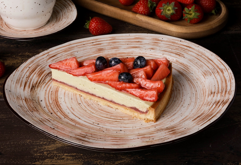 Корж из песочного теста на миндальной муке покрытый клубничным соусом, кремом из натуральной фисташковой пасты. Украшен свежими ягодами.
