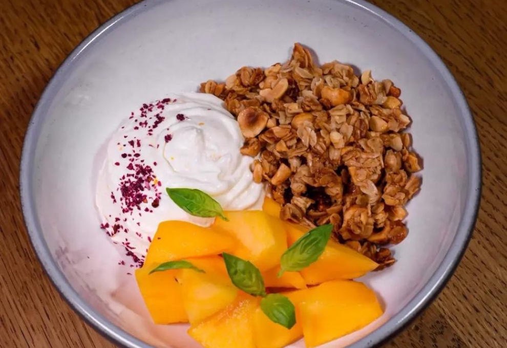 цитрусовый крем, хурма свежая, гранола, микрозелень (мини базилик)