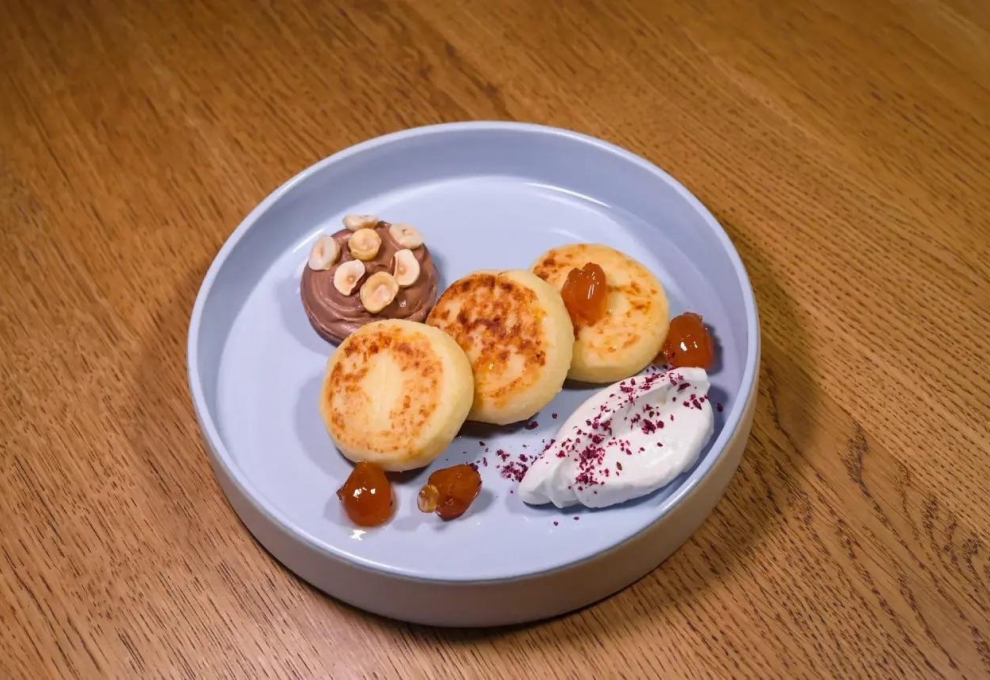 Сырники с копчёным сыром сулугуни и вареньем из белой черешни