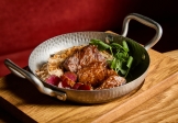 Томленые говяжьи щечки в красном вине со специями. Мясо глазируется перечным ткемали. Подается с нежным пюре из фасоли с беконом. И хрустящими, маринованными огурцами