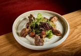 Куриная печень, приготовленная в соусе демиглас, с салатом из вяленой груши, маринованных черри и микса из листовых салатов на сливочном соусе