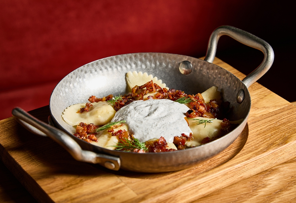 Картофельные вареники, обжаренные с беконом и луком. Подаются с копченым муссом из креметте и сливок
