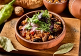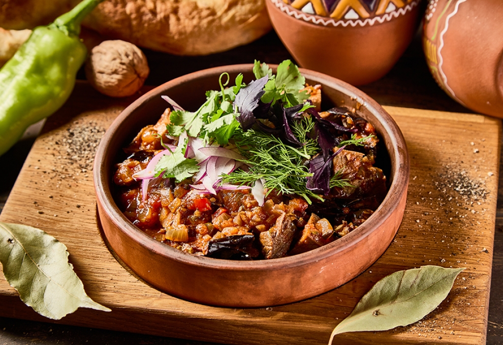 Кусочки нежной говядины, тушённые с томатами пилати, сладким болгарским перцем, луком, чесноком и грузинскими специями. Посыпается рубленой кинзой