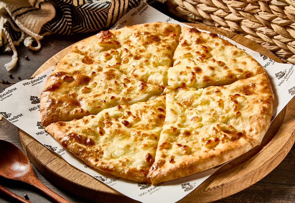 Грузинское закрытое хачапури с начинкой из сыров: имеретинский, сулугуни, с добавлением топленого сливочного масла и яйца, посыпанное сверху тертым сыром, который при запекании образует ароматную сырную корочку (25 см)