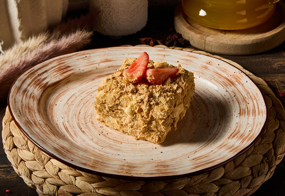 Классический Наполеон с заварным кремом из сливок, сгущенного молока, бурбонской ванилью, украшенный свежей клубникой