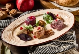 Ассорти пхали из различных овощей: болгарского перца, свеклы, фасоли, шпината и баклажана. Пхали – это традиционная грузинская холодная закуска, состоящая из овощей, перетертых с большим количеством грецких орехов, по консистенции похожа на паштет. Подается с кинзой, грецким орехом и зернами граната