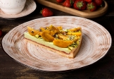 Корж из песочного теста на миндальной муке покрытый клубничным соусом, кремом из натуральной фисташковой пасты. Украшен свежими кусочками хурмы